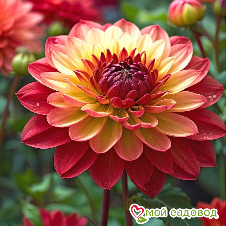 Георгин (Dahlia) — род многолетних травянистых клубневых растений семейства Астровые (Asteraceae) или Сложноцветные (Compositae). Георгины родом из горных районов Мексики и Центральной Америки были завезены в Европу в конце XVIII века и быстро завоевали популярность благодаря своей красоте и разнообразию форм и окрасок. На сегодняшний день существует более 42 видов георгинов и десятки тысяч сортов, различающихся по высоте куста, форме и размеру цветков, окраске и махровости. Внешний вид и строение: Георгин — это травянистое растение с клубневидными корнями, которые служат для запасания питательных веществ. Клубни георгинов имеют продолговатую или веретенообразную форму и могут быть разного размера, в зависимости от сорта. Стебли георгинов прямостоячие, полые, ветвистые, высотой от 30 см до 2,5 метров и более, в зависимости от сорта. Листья георгинов супротивные, перистые или дважды перистые, зубчатые по краю, обычно зелёные, но у некоторых сортов могут быть красноватыми или пурпурными. Цветки георгинов — это сложные соцветия, представляющие собой корзинки, состоящие из язычковых и трубчатых цветков. Язычковые цветки обычно крупнее и имеют разнообразную форму и окраску, а трубчатые цветки — мелкие и расположены в центре корзинки. У махровых сортов трубчатые цветки превращаются в язычковые, увеличивая махровость соцветия. Форма соцветий георгинов очень разнообразна: от простых ромашковидных до шаровидных, кактусовидных, помпонных и т.д. Диаметр соцветий варьируется от 5 до 30 см и более. Окраска соцветий также очень разнообразна и включает в себя практически все цвета и оттенки, кроме чистого синего и зелёного. Часто встречаются двухцветные и многоцветные сорта с контрастными полосками, пятнами, штрихами и другими узорами. Классификация георгинов: Существует несколько систем классификации георгинов, основанных на различных признаках. Наиболее распространенной является классификация по форме соцветий, согласно которой выделяют следующие основные группы: Простые (одноцветковые): соцветия с одним рядом язычковых цветков и открытой сердцевиной из трубчатых цветков. Анемоновидные (Anemone-flowered): соцветия с несколькими рядами язычковых цветков и выпуклой серединкой из удлинённых трубчатых цветков. Воротничковые (Collarette): соцветия с одним рядом крупных язычковых цветков и одним рядом более мелких язычковых цветков, образующих воротничок вокруг серединки из трубчатых цветков. Кувшинковые (Nymphaeaceae): соцветия с широкими, плоскими язычковыми цветками, расположенными горизонтально, напоминающими цветки кувшинок. Декоративные (Decorative): соцветия с многочисленными широкими язычковыми цветками, полностью закрывающими серединку. Шаровидные (Ball): соцветия шаровидной формы, с плотно свернутыми язычковыми цветками. Помпонные (Pompon): соцветия шаровидной формы, меньшего размера, чем шаровидные, с плотно прилегающими друг к другу язычковыми цветками. Кактусовые (Cactus): соцветия с узкими язычковыми цветками, свернутыми в трубочки, напоминающими иголки кактуса. Полукактусовые (Semi-cactus): соцветия с язычковыми цветками, свернутыми в трубочки не более чем наполовину. Смешанные (Miscellaneous): сорта, не относящиеся ни к одной из вышеперечисленных групп. Условия выращивания и уход: Георгины теплолюбивы и светолюбивы, поэтому для их выращивания необходимо выбирать солне